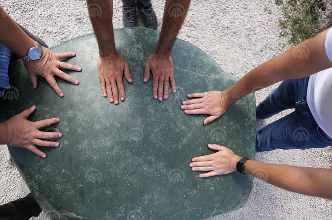 Hattuşa’daki kazı çalışmalarına başkanlık yapan Doç. Dr. Andreas Schachner, AA muhabirine yaptığı açıklamada, yeşil taşın, bölgedeki taşlardan çok farklı olduğu için dikkat çektiğini söyledi. Ziyaretçiler tarafından mutlaka ziyaret edilip incelenen taşın özel bir taş olmadığını vurgulayan Schachner, şunları dile getirdi: “Bu taş aslında çok özel bir taş değil. Taşın cinsi serpentinit ya da nefrit (yeşim taşı). Bölgede bulunan bir taş. Yekpare şekilde korunmuş olması dikkati çekiyor. Antik kültürel anlamında özelliğini pek bilemiyoruz. Bu taş bulunduğu yerde kesinlikle kullanılmamış. Taşın sol tarafında yer alan Hitit dönemine ait kapı eşiği bize insanların yürüdükleri tabanın yüksekliğini gösteriyor. Bu taş bu eşiğin bir metre altında duruyor. Dolayısıyla Hitit döneminde burada kullanılmamış. Tapınak bölgesinde Hititlerden sonra her dönemde kullanım olmuş. Burası mezarlık, mesken olarak kullanılmış. Sürekli bir karıştırılma söz konusu. Bu nedenle taşın hangi döneme ait olduğunu kestirmek zor hatta imkansız.” (A.A)