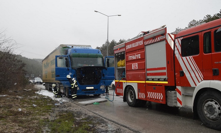 Çorum Belediyesi İtfaiye ekiplerinin müdahalesiyle söndürülen TIR’da hasar oluşurken, yangınla ilgili inceleme başlatıldı. Yangının nasıl çıktığını anlatan Azeri sürücü Ezizali, Ankara’dan Kazakistan’a giderken, Hasan Zahir mevkiinde yokuşu çıkarken, araçtan bir anda dumanlar çıktığını söyledi. Aracı hemen durdurarak itfaiye ekiplerine haber verdiğini anlatan sürücü, Tır’ın motor kısmının alev aldığını ekiplerin müdahalesi ile yangının söndürüldüğünü belirtti.